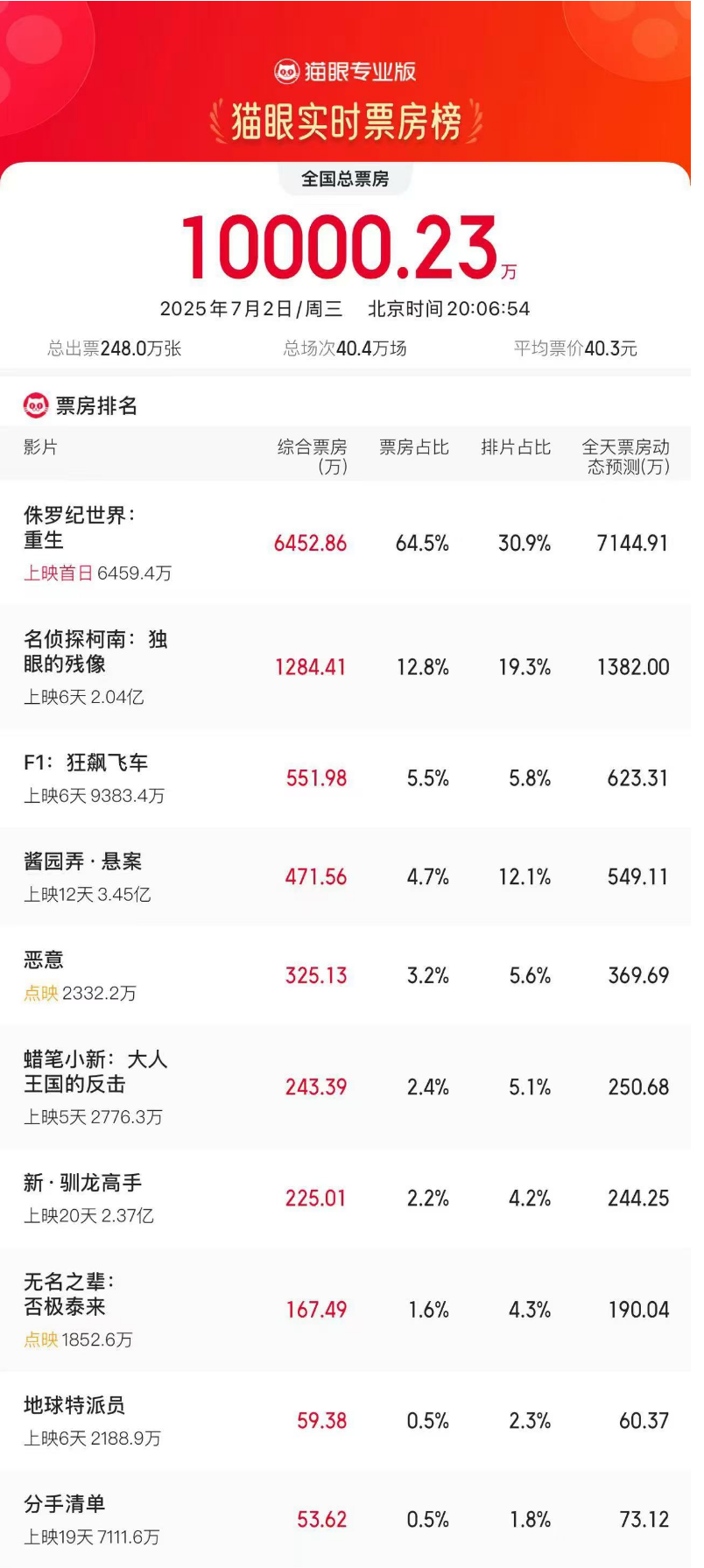 7月1日晚间,2025年暑期档(6月-8月)电影市场总票房(含预售)突破20亿元。